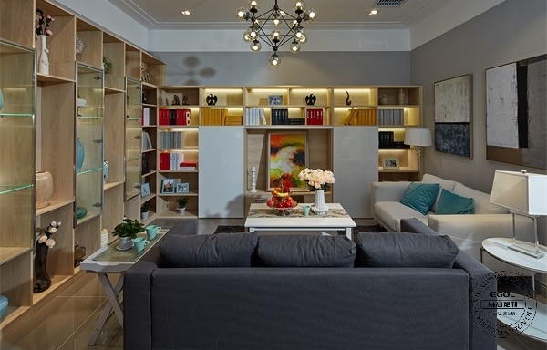 首先引入眼簾的就是易高定制家居這款經典儲物式電視柜,由多個開放式儲物格及玻璃柜門與推拉式電視柜門組成,木色與白色搭配的恰到好處。亮點莫過于可推拉的電視柜門,如今很多家庭想轉變以電視為客廳中心的傳統習慣,而是讓家人在客廳更多的交流與溝通。可推拉的電視柜門讓客廳隨時切換會客模式與家庭相處模式,且儲物空間極大,是當下非常受青睞的一款定制家具產品。