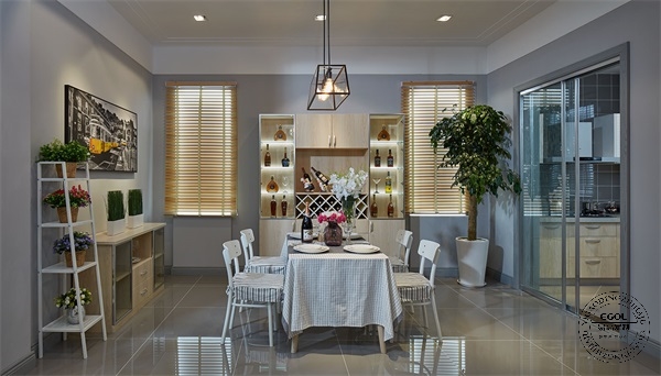 其次看到的就是餐廳區域,整體高級灰的色調看起來質感十足。餐邊柜與酒柜則都延續了電視柜的色調搭配,清新自然??梢钥吹絻ξ锟臻g除了開放式與半開放式還有封閉式,餐廳區域可能會放鍋碗或者食物,這里設置封閉式柜也是非常合適。