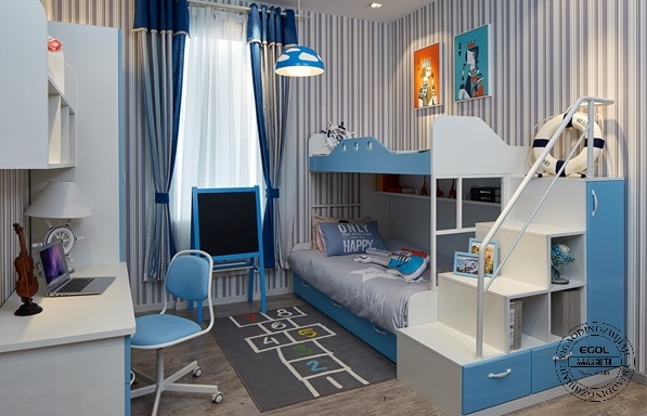 然后我們可以看到眼前一亮的兒童房區域。雖然整體色調為高級灰,但是兒童房色彩還是更為明亮點好,藍色沉穩大方很適合作為兒童房的主色調。兒童房區域主要包括高低床與兒童衣柜、兒童書桌椅三套產品。所有邊角都做了圓角處理,也是易高定制家居為保障安全做的措施之一。
