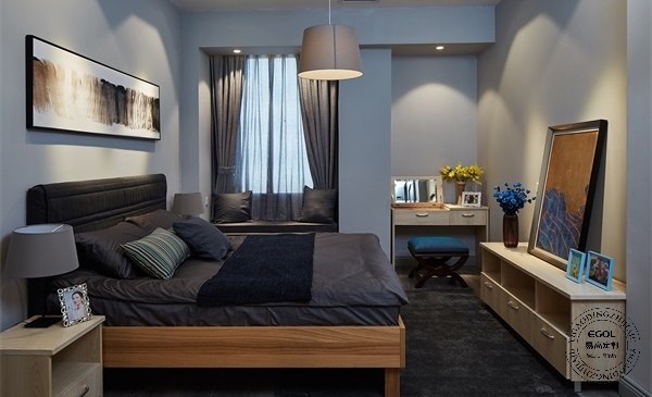 最后是臥室區域。拋去一天的疲憊,臥室是放松身心最好的區域,顏色依舊采用主色調,床品與窗簾也相呼應。這里可以看到梳妝臺與飄窗位置中間有一根柱子,旁邊凹進去的區域似乎十分尷尬,但試著定制一個個合乎尺寸的梳妝臺進去既利用了空間也填補了看起來有些缺憾的戶型。
