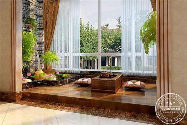 日式設計講究簡潔,但是在細節的打造上絕不馬虎,力求小至一石一木一花都能夠配合整體的設計。例如下圖的陽臺,設計師先在陽臺的一角劃出兩平方米左右的空間,用大小不一的鵝卵石隨意地鋪排在上面。細心觀察,鵝卵石選用的都是黑色或深褐色,與淺米色的石燈、石缸形成色彩對比。一盞小小的石燈在黃昏時會透出明黃色的燈光,此時,若就著燈光憑欄遠眺,實在是一件賞心樂事。石燈旁邊還有一個石缸,盛著一汪清水,流水緩緩地溢出缸邊,悄然無聲。為了給陽臺帶來一些生氣,石缸里面可以養上幾尾金魚。經過一整天的工作,回到家里,喂魚賞花,是一樂也。