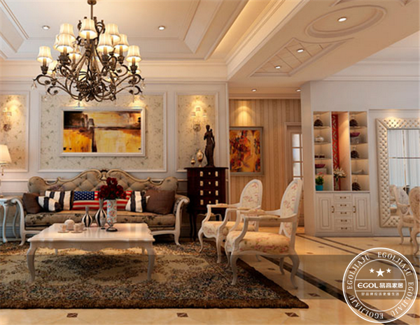 典型的古典歐式風格,以華麗的裝飾、濃烈的色彩、精美的造型達到雍容華貴的裝飾效果。歐式客廳頂部喜用大型燈池,并用華麗的枝形吊燈營造氣氛。門窗上半部多做成圓弧形,并用帶有花紋的石膏線勾邊。室內有真正的壁爐或假的壁爐造型。墻面用高檔壁紙,或優(yōu)質乳膠漆,以烘托豪華效果。