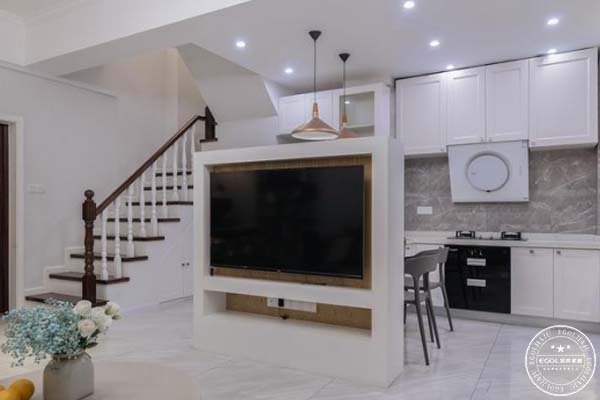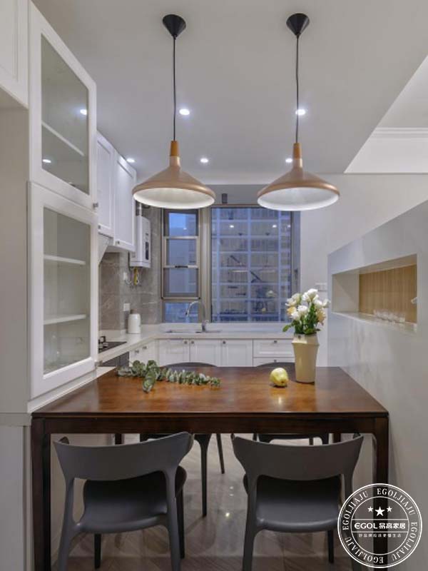 樓梯下方空間設(shè)計了一整排儲物柜子,增加收納;櫥柜也一起連過來做了通透玻璃高柜,方便后期防止被子紅酒之類物品。餐廳面隔斷中間又做了局部掏空,方便放置小物品也增大視覺效果,告別壓抑。隔斷,屏風他的寓意是有靠山,聚財納福。