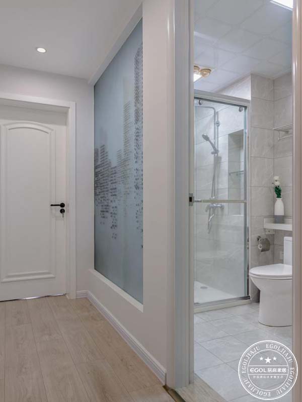 衛(wèi)生間外墻嵌入大面積磨砂玻璃增加通透感,一堵實墻就壓抑很多。衛(wèi)生間里的壁龕設(shè)計,也為淋浴房加分不少。