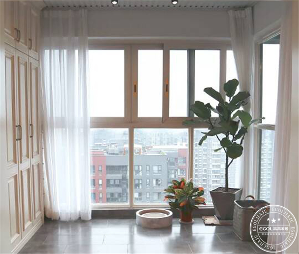 白色的窗簾保留了陽臺的透光性,將陽臺處的地面換成了地磚,種植物不用擔心沒有陽光,也不用怕滲透的水將地面損壞。左邊增加了一個儲物柜,不常用的東西可以放在里面,增加了收納功能。