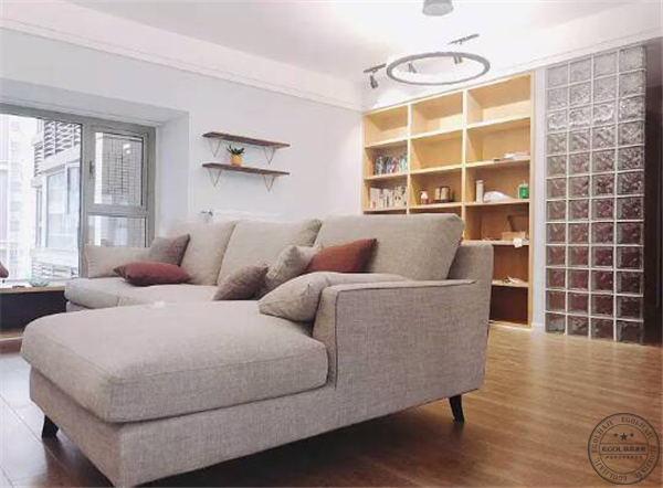 一進家門首先就能感受到玻璃磚帶來的一絲清爽之意,簡單的布置,原木色的地板與麻布色的沙發簡單卻不失大氣、原始色彩的質感使整個空間的清爽淡雅。