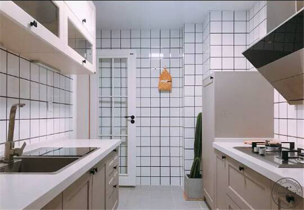 U型廚房設計,廚房作業動線流暢。本著樸素、實用初衷進行設計,廚房吊頂采用了防水石膏板,刷乳膠漆。透明的櫥柜門,想要拿的東西一眼就能看到。各種廚房小用具一律外掛收納,整潔美觀,也便于隨手取放。墻面采用白色小方磚,做了黑色美縫的處理,便于清潔。一眼看上去整整齊齊,強迫癥都治好了。