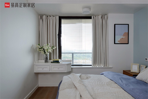 書桌靠窗,定制一排書桌,翹腳定制收納柜,書桌的通風采光效果也是非常棒的,視野效果更是一絕。辦公看書累了就可以抬眼看看遠處的風景,舒展一下身心。臥室空間比較充足的話可以考慮設(shè)計兩個飄窗,一個辦公看書,定制書桌書柜,一個休閑娛樂,定制一個榻榻米,休閑娛樂兩不誤。