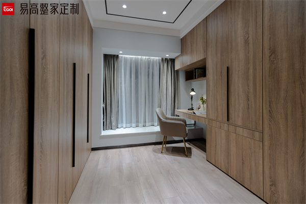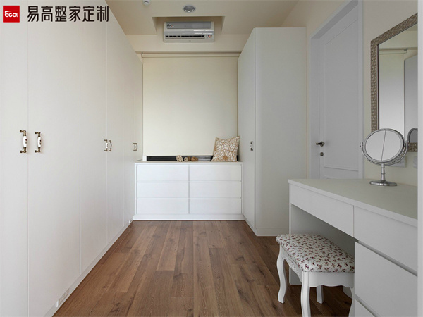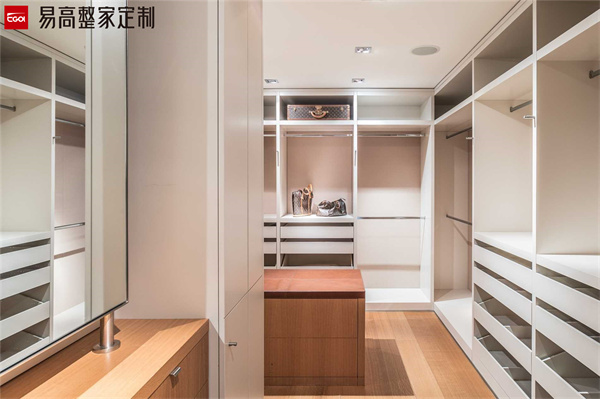 超大的L型衣帽間設(shè)計,具有強(qiáng)大的儲物功能與實(shí)用性,與梳妝臺一體化的設(shè)計,讓梳妝穿搭一并搞定,從細(xì)節(jié)處提升幸福感。簡約的線條、考究的比例,以及井然有序的設(shè)計感,讓空間更加整潔舒適,有種隱約的流動美感。家裝的個人品味也滲透在細(xì)節(jié)之處,整個衣帽間通透性設(shè)計,更顯時尚感。