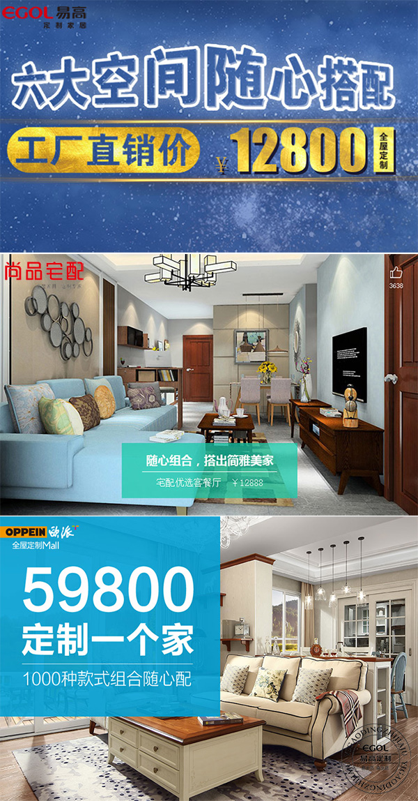 觀察“易高、歐派、尚品宅配”等網(wǎng)站,我們不難發(fā)現(xiàn)套餐式營銷無非包括全屋的六大空間:臥室、廚房、客廳、餐廳、陽臺、玄關等等。過去消費者想配齊全部空間產(chǎn)品,可能要經(jīng)過復雜的計價方式最后得出一個模糊的概念,如今19800、16800套餐將數(shù)字具體化。消費者不僅可以自行預估定制家具面積,還能自行規(guī)劃空間布局。價格上卻清晰了很多。