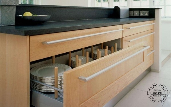 廚柜最好做成抽屜 推拉式這樣方便取放,視覺(jué)也較好。而吊柜一般做成30到40cm寬的多層格子,柜門(mén)做成對(duì)開(kāi),或者折疊拉門(mén)形式。